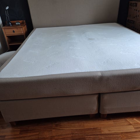 Mio kontinentalsäng med tillhörande sänggavel i grått tyg. Sängen har en stoppad, knappljuten gavel och en tygklädd underdel. Översta lagret består av en vit bäddmadrass som är ny köpt. Tyget på sängens hörn visar viss noppring och slitage från min katt enligt bilder.