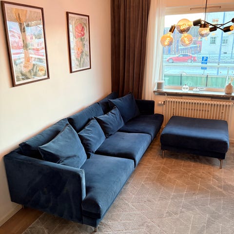 Divansoffa i fint skick från Chili. Blå sammet. Längd ca 282 cm. Förhandlingsbart pris vid snabb affär!