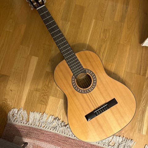 Akustisk klassisk gitarr i naturfärg. Gitarren har nylonsträngar, greppbräda med bandmarkeringar och ljudhål. Kroppen är i trä med blank finish och traditionell utformning. Medföljer vadderat gigbag/fodral med bärremmar och ytterficka för tillbehör. Passar för spel i hemmet, övning och enklare framträdanden.