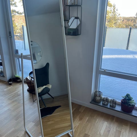 IKEA klädställning med helkroppsspegel i vit metallram. Fristående modell som kombinerar spegel och klädförvaring i samma möbel. Spegeln är rektangulär och helfigur, med rundade hörn och stabilt stativ. Baksidan har stång och ställning för upphängning av kläder, väskor eller accessoarer. Passar i hall, sovrum eller klädkammare för att underlätta påklädning och förvaring.