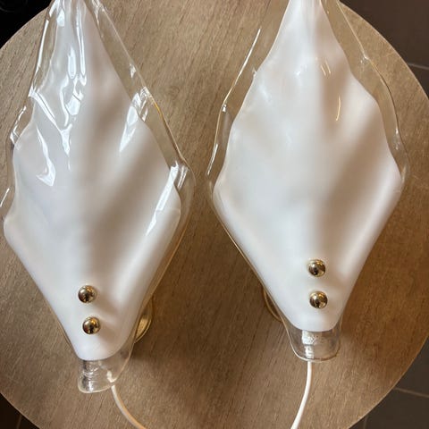 Säljer två st vägglampor i frostat glas med ett diskret mönster.