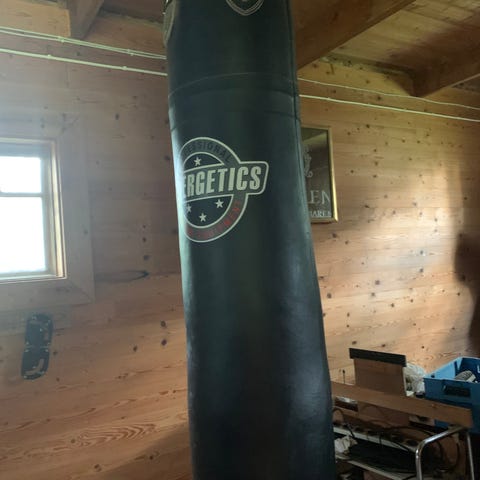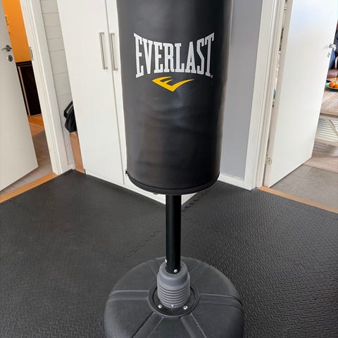 Everlast Omniflex boxsäck med stativ i svart färg. Fristående modell med rund fot som kan fyllas för ökad stabilitet. Säcken är monterad på en flexibel stolpe som ger fjädrande rörelse vid slag och sparkar. Passar för boxningsträning och konditionsträning hemma. På bilderna syns även ett par röda boxhandskar ingå.