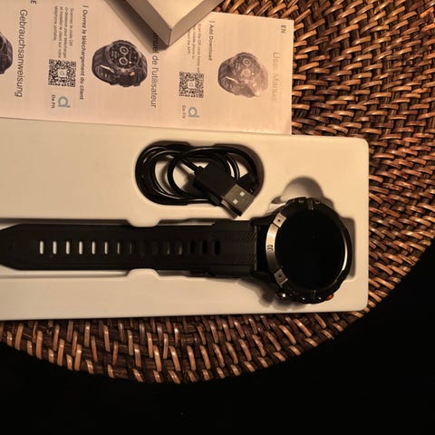 Smartklocka med rektangulär urtavla och svart armband i gummi eller silikon. Klockan levereras i originalförpackning med laddkabel enligt bild. Passar för vardagsanvändning och träning, med funktioner som vanligtvis finns i smartklockor, såsom notifieringar och aktivitetsmätning beroende på modell och kompatibel telefon. Påminner mkt om ett amerikanskt varumärke med samma funktioner