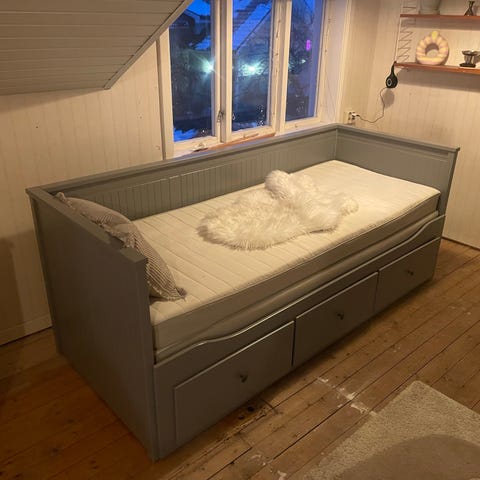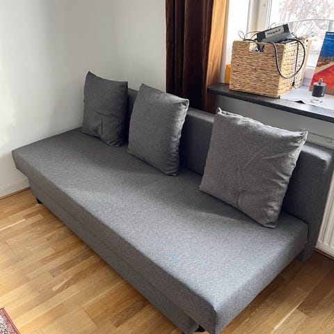 Endast använd som extrasäng vid enstaka tillfällen. Lite solblekta ryggkuddar på baksidan, i övrigt i väldigt fint skick.