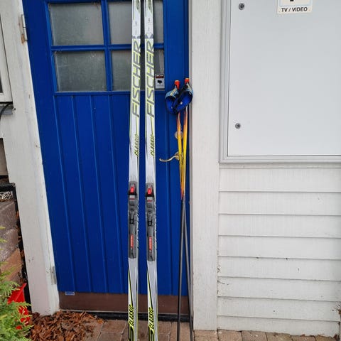 AI-text: Fischer längdskidor med matchande Fischer längdpjäxor och två par stavar från One Way och Leki. Skidorna är i klassisk modell, vallningsfria med svart och gul design. Pjäxorna är svarta, vita och gula med snörning och dragkedja framtill. Stavarna har olika längder, ett par i silver med korkhandtag från One Way och ett par i rött med plasthandtag från Leki. Utrustningen är avsedd för längdskidåkning och passar för träning eller fritidsåkning på preparerade spår.