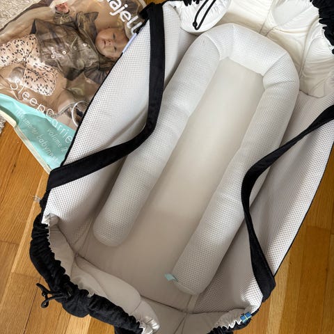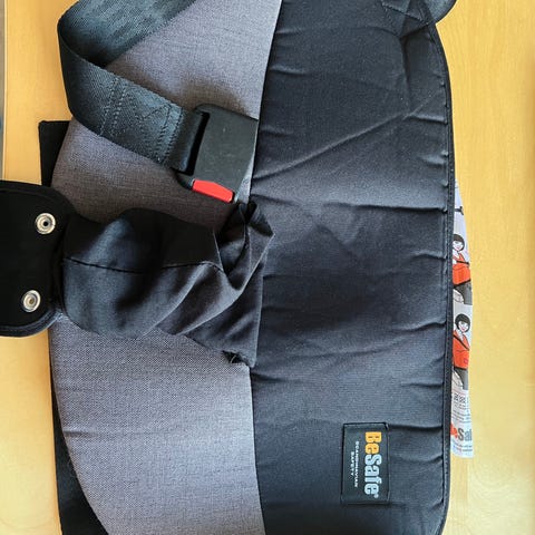 Wonder Space bärsele i vit färg med flera justerbara remmar. Medföljer brun förvaringspåse med Wonder Space-logotyp. Lämplig för att bära mindre barn på ett ergonomiskt sätt, med stöd för både barn och bärare. Material och exakta mått framgår inte av bilden.