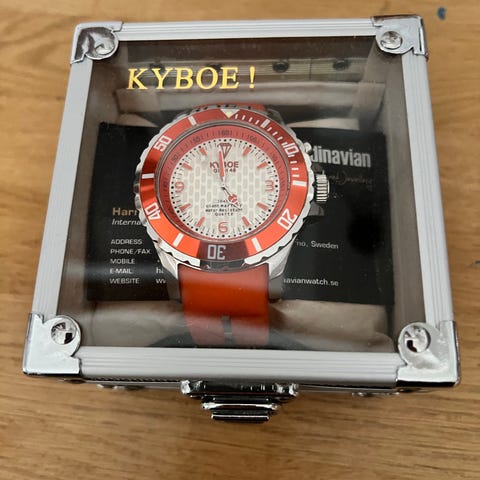 Snygg klocka med röd urtavla och svart armband.