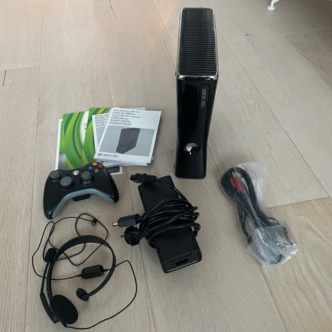 Microsoft Xbox 360 spelkonsol i svart färg. Konsolen är avsedd för spel och underhållning och ansluts till TV eller skärm via HDMI eller annan kompatibel anslutning beroende på modell. Till konsolen följer en svart samt en vit Xbox 360-handkontroll, utformad för trådlös användning med batterifack på baksidan. Passar för användning med Xbox 360-spel och tillbehör som är kompatibla med denna konsolmodell.