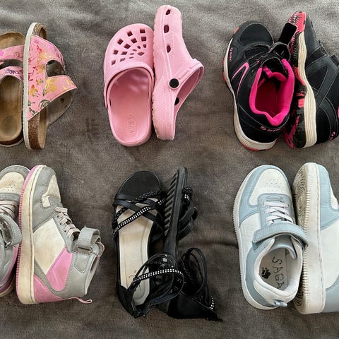 Blandning av olika typer av skor, bland annat sneakers, kängor, sandaler och vardagsskor i flera färger som svart, rött, rosa och flerfärgat. Skorna passar för barn/unisex och kan användas till vardag, skola och fritidsaktiviteter beroende på modell och säsong.