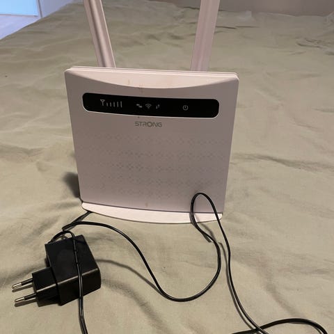Enheten har fyra externa antenner och medföljer med strömadapter enligt bild. Lämplig som trådlös router i hem- eller kontorsnätverk.