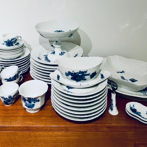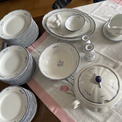 Svaneholm porslin servis i blåvitt mönster. Servisen består av flera delar, bland annat tallrikar, fat, koppar med fat samt en liten burk med lock. Dekoren är blommig i blå toner på vit botten. Passar som middagsservis eller kaffeservis i kök eller matsal.