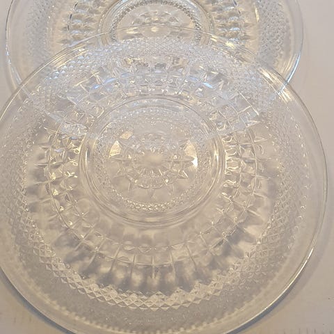 Små mönstrade glasassietter i klart glas. Assietterna har dekorativt slipliknande mönster och rund form, tunga. Passar till servering av exempelvis kakor, dessert eller mindre rätter. Säljs som flera likadana tallrikar i samma stil.