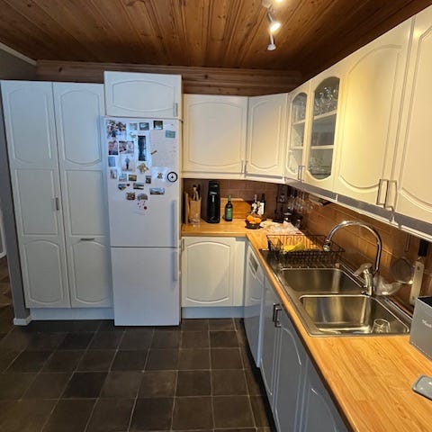 Köket är väl använt men fin stomme i massivt trä och kan slipas fint för fortsatt användning. Ingen av vitvarorna är trasiga vad vi vet och kyl/frys samt diskmaskin ser hyfsat nya ut.