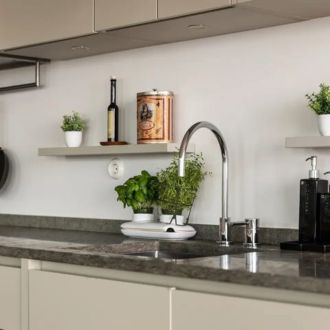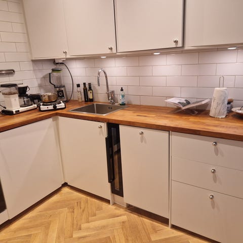 Ena sidan (3 meter) med bänkskåp med överskåp, spis, köksfläkt med kolfilter, rostfri diskbänk inklusive blandare och diskmaskin (45cm).
