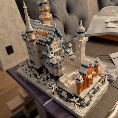 Sagoslott som är byggt med Legoliknande byggklossar i liten storlek.