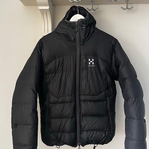Haglöfs dunjacka för dam i storlek M. Jackan är blå och fylld med dun, vilket ger värme och isolering. Modellen har huva, hel dragkedja framtill och sidofickor med dragkedja. Passar som ytterjacka för vardag och utomhusaktiviteter i kallare väder.