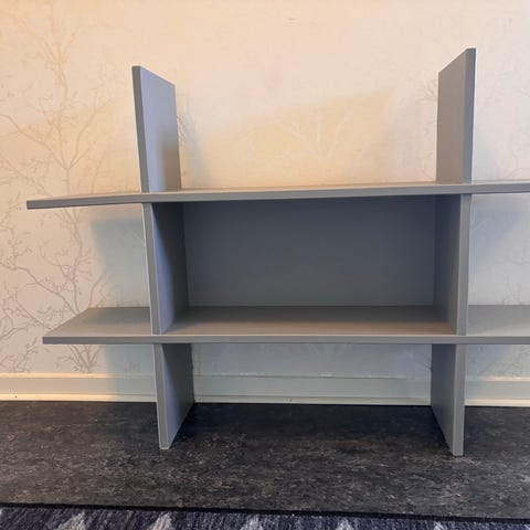 En stilren öppen hylla med fyra spotlights. Nedersta hyllplanet är 20 cm djupt. Vi fick denna men tyvärr passade den inte i vårt kök. En av spottarna behöver bytas ut.