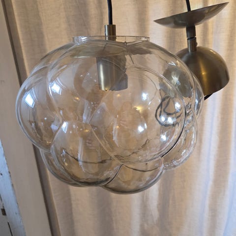 Fin taklampa med nio ljuskällor. En glaskupa har gått sönder men finns att köpa till nya.