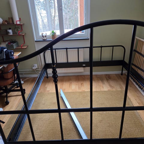 Rejäl och stabil sängram i metall med dekorativa detaljer.