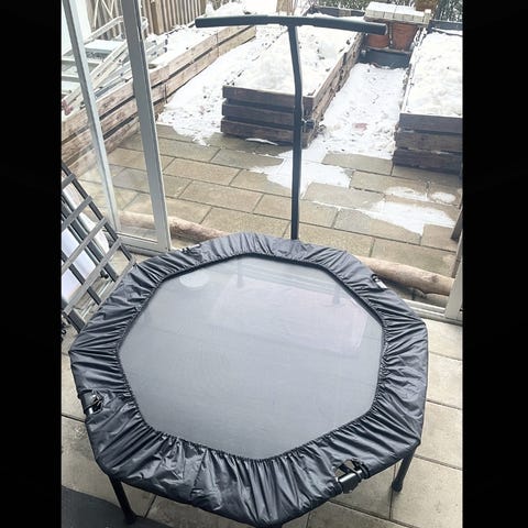 Rund minitrampolin med grönt kantöverdrag och svart hoppduk. Utrustad med flera ben med gummifötter för stabilitet vid användning inomhus. Lämplig för enklare träning, uppvärmning eller lek. Storlek och märke är inte angivna, men modellen är en kompakt trampolin som får plats i de flesta rum.