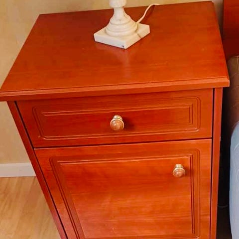 Ett modernt sidoskåp i mörkbrun träfinish med svarta ben. Passar utmärkt som sängbord med gott om förvaringsutrymme inuti.