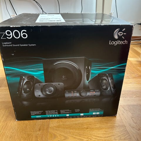 Systemet består av en subwoofer, en centerhögtalare och flera satellithögtalare för surroundljud. Passar för användning med dator, TV eller annan ljudkälla som stödjer 5.1-ljud. Kablar för anslutning mellan högtalarna ingår enligt bild.