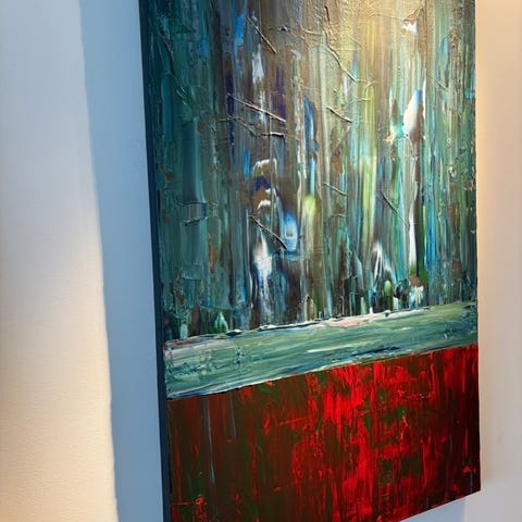 Detta är en riktig statement-tavla som förändrar ett helt rum. Den intensiva röda färgskalan och det kraftfulla uttrycket gör att den verkligen drar blickarna till sig – perfekt i större vardagsrum, trapphus eller kontorsmiljö.