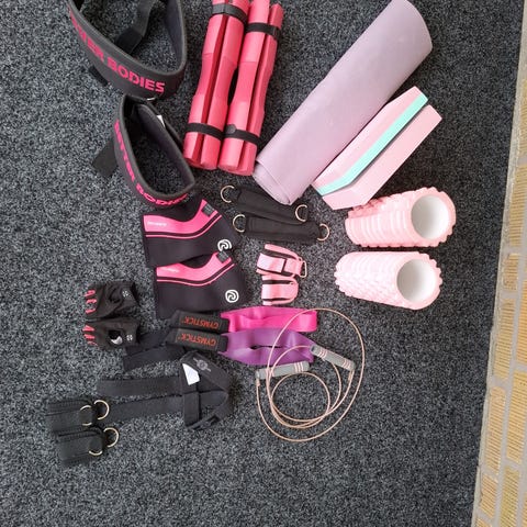 1st vägghylla i metall samt 1st väggförvaring i metall för förvaring av gummiband, hopprep och liknande utrustning.