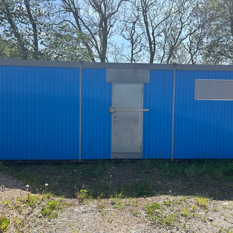 Byggbod arbetsbod i grön färg. Utrustad med flera fönster, varav vissa har galler på utsidan. Invändigt finns ett större rum med belysning i taket samt ett mindre avskilt rum. Golvet är mörkt och väggar och tak är målade i vitt. I boden finns även separata skåp/avdelare i rött och grått. På utsidan sitter en elcentral med flera uttag för anslutning av el, 16 amperes anslutning. Bodens utformning lämpar sig för användning som arbetsbod, personalutrymme eller enklare kontor på byggarbetsplats eller liknande miljöer.