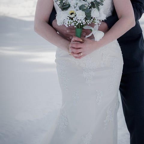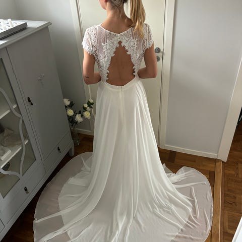 Vit brudklänning i storlek 38. Klänningen har spetsliv med korta ärmar och rund halsringning. Livet är detaljerat med broderad spets och genombrutna partier upptill. Kjolen är lång och vid med flera lager tunt tyg som ger ett fallande intryck. Baksidan har öppet parti i ryggen med spetsdetaljer. Aldrig använd. Nypris 8995 kr.