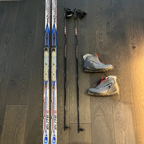 Salomon Elite 5 Escape längdskidor med tillhörande pjäxor och stavar. Skidorna är klassiska längdskidor i modell Elite 5 Escape med SNS Universal-bindningar.