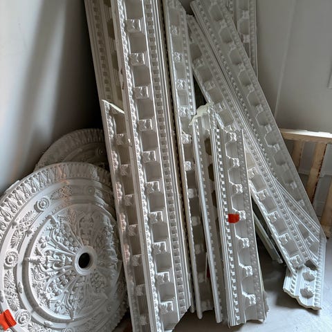 Grundmålade taklister, golvsockel, dörr- och fönsterfoder