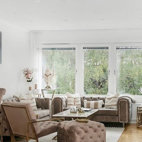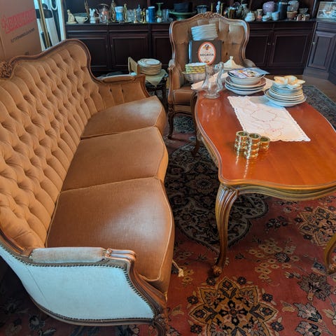 Soffgrupp bestående av två 3-sitssoffor och en fåtölj i sammet. Sofforna är klädda i brun sammetsklädsel med knapptuftad sits och rygg samt smala, något utåtvinklade armstöd. Fåtöljen har samma modell med djup sits och höga armstöd, klädd i grön sammet. Alla delar står på smala, mörka ben som ger ett lätt intryck. Passar som sittgrupp i vardagsrum eller större rum där man vill ha flera sittplatser i samma stil.Går att sälja separat.