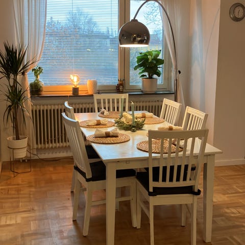 Matgrupp bestående av ett rektangulärt matbord i ljusbrunt trä och tre matchande stolar i samma material och färg. Bordet har rundade hörn och står på ben i trä och metall. Stolarna har ryggstöd och sits i trä med enkel, rak design. Passar som matplats i kök eller mindre matrum. bordets höjd är också justerbar.