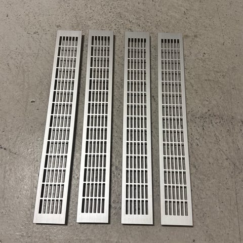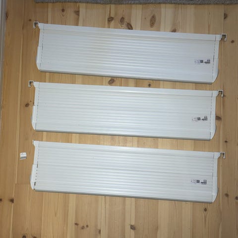 Säljer 43 stycken handtag till köksskåp och lådor i metall. Längd 19 cm. Skruvhål cc 16 cm.