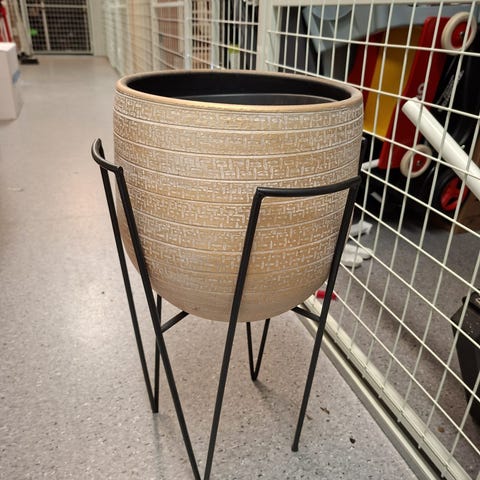 Korg på ställning i brun rotting med svart metallställ. Korgen har två handtag upptill och är fast monterad på ett stativ med fyra smala ben. Passar exempelvis som förvaringskorg eller ytterkruka för växter inomhus. Enkel att placera i olika rum tack vare den upphöjda ställningen som ger luft under korgen.