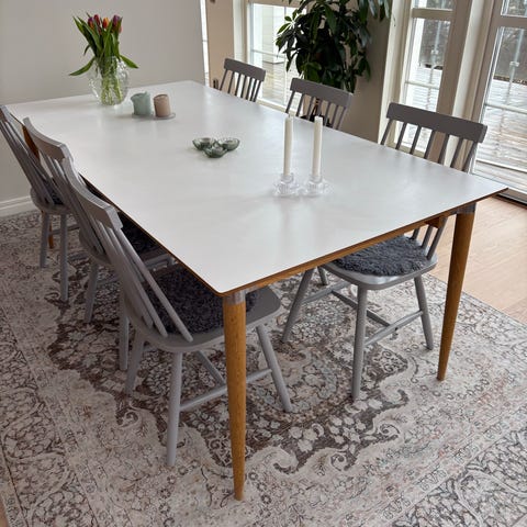Matbord med skiva i solid ek och vitt underrede. Bordet kan förlängas med de två lösa iläggsskivorna. Storlek 100*164 cm (100*254 med två iläggsskivor). Bordet är i mycket fint skick.
