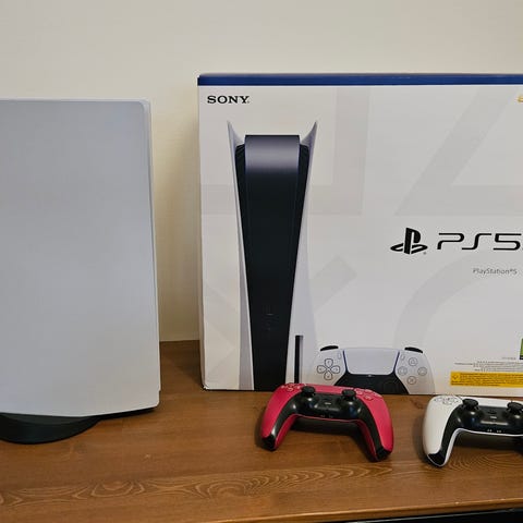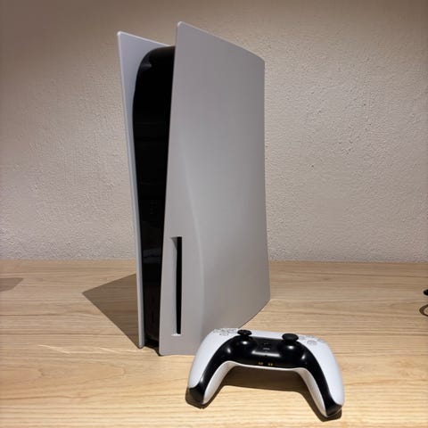 Sony Playstation 5 spelkonsol i vit färg med svart mittsektion. Konsolen på bilden är standardmodellen med skivläsare. En trådlös handkontroll (DualSense) i vit och svart färg syns tillsammans med konsolen. Playstation 5 är avsedd för tv-spel och underhållning, med stöd för moderna spel och mediematerial.