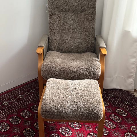 Två supersköna, fällbara fåtöljer med fotpallar av okänt märke. Köpta på svenska hem för typ 18 år sedan. Omklädda av tapetserarverkstad i Linné i Göteborg för 1,5 år sedan. Färg beige/gråa. Fint skick! Enda skavank lite skav på ett ben sen tidigare flytt. Säljes ihop för 4000 kr för båda två eller en och en för 2500kr.. Fotpallarna ingår.