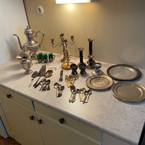 Blandat parti hushållsartiklar bestående av serveringsfat, tallrikar, skålar och vaser i glas och keramik. På bilderna syns bland annat olika uppläggningsfat i glas och metall, assietter och prydnadstallrikar, mindre skålar i olika färger samt flera vaser och kannor i glas och keramik. Olika former, mönster och storlekar. Passar för servering, dukning och dekoration i hemmet. Säljes tillsammans som ett parti enligt bilderna eller var för sig. Hämtas av köpare 22/2. Ge förslag på pris.