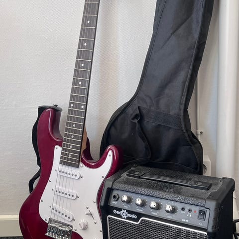 Medföljande utrustning på bilderna inkluderar en förstärkare samt en bärväska och kabel.