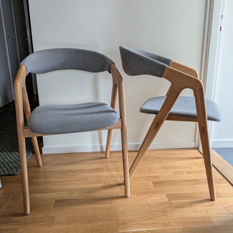 Inköpta på Folkhemmet och stolarna har namnet ”Apelzin”. Trä i stolen har inga skador. Lädret har normalt slitage.