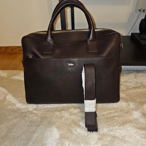 Tiger of Sweden portfölj väska i läder för man. Väskan är brun och har dubbla bärhandtag upptill samt avtagbar axelrem. Utsidan har en större ficka framtill. Passar för exempelvis dokument, dator och arbetsrelaterade tillhörigheter. Tillverkad i läder med slät yta och diskret logotyp framtill.