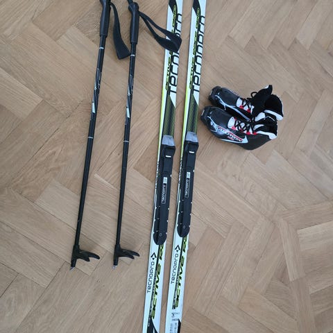 Atomic längdskidor med stavar och Salomon barnpjäxor storlek 29