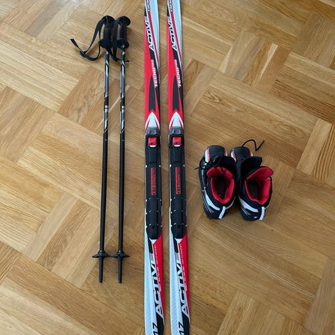 Atomic längdskidor med tillhörande stavar och Salomon barnpjäxor. Skidorna är klassiska längdskidor i röd och vit färg med bindningar anpassade för Salomon-pjäxor. Till skidorna hör ett par längdskidstavar med handremmar. Pjäxorna är Salomon barnpjäxor i svart, vit och röd färg, märkta som barnmodell i storlek 29 (UK 11K, US 11,5). Utrustningen är avsedd för barn och passar för klassisk längdskidåkning.