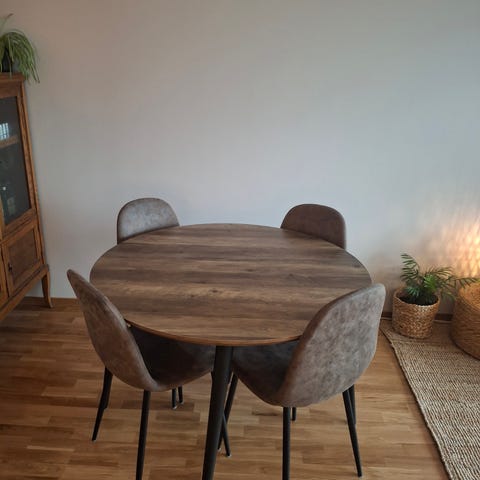 matbord med rund bordsskiva i mörkt betsat trä. Bordet har en robust känsla