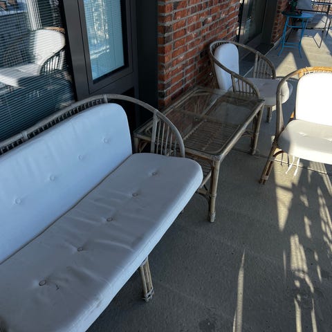Balkongmöbler i set med bord och stolar. Ett mindre drinkbord i metall med ribbad topp samt en stol med rund sits och spända snören i metallstativ. Dessutom ingår ett bord och två stolar i rottingliknande material med sittdynor. Passar för användning på balkong eller uteplats som sittgrupp för avkoppling och enklare måltider.