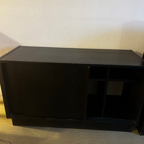Svart tv-bänk med en sektion med glasdörr och en sektion med utdragslåda. Bänken har raka linjer och metallfärgade detaljer på handtag och kanter. Öppen hylla bakom glasdörren ger plats för mediautrustning, och lådan kan användas för förvaring av tillbehör. Passar för placering av tv och annan hemelektronik i vardagsrum eller liknande utrymme.Finns ställning i skåpet till LP-skivor. Hämtas av köpare 22/2.