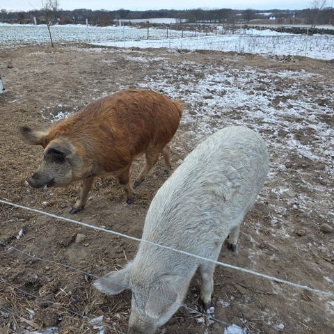 3 st grisar två gyltor och en kastrat födda nov o dec, går på box dom har inte varit ute men ser inte det som ett bekymmer att ha dom ute.