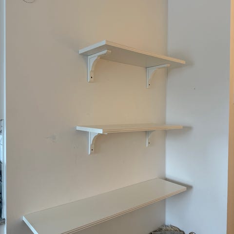 IKEA trähyllor. Flera brädor i liknande längd och bredd, med naturlig träådring i ljusa till mellanmörka nyanser.